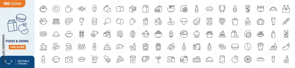 Fototapeta food and drink icon set. Contain icons related to various foods and drinks. Editable stroke. Vector illustration