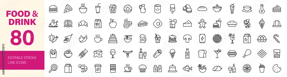 Fototapeta Food and drink icon set. Containing meal, restaurant, fast food, beverage, vegetables, fruits, desserts, meat, fish, coffee, cocktail and more. Editable line icons. Vector illustration.