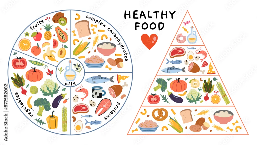 Healthy food plate and eating pyramid concepts. Infographics with the required proportions of diet. Vegetables, fruits, proteins, carbs and oils. Vector isolated illustration, flat design