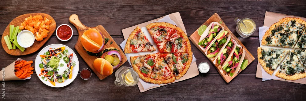 Fototapeta Healthy plant based fast food table scene. Above view on a wood banner background. Cauliflower crust pizzas, bean burgers, mushroom tacos and vegetarian sides.