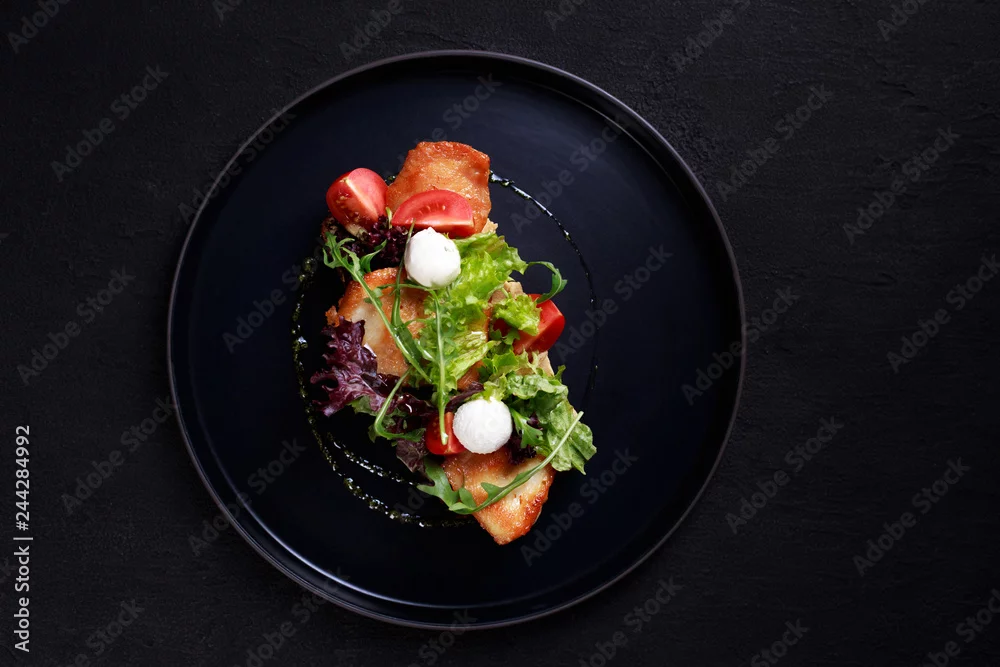 Fototapeta healthy snack, toast for breakfast or lunch with rye bread, grilled chicken and vegetables. traditional danish open sandwich smorrebrod. whole food and diet, clean eating concept.