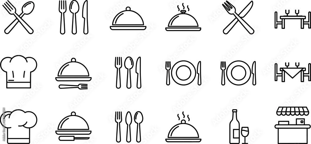 Fototapeta Restaurant and dining icon collection featuring cutlery, chef hats, serving trays, plates, wine, tables, and simple food service symbols