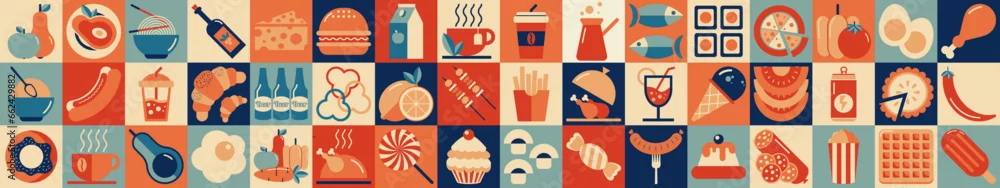 Fototapeta Set of 48 colorful icons related to food and drinks. Abstract food and drink geometric pattern. Mosaic style. Collection of food icons. Vector illustration
