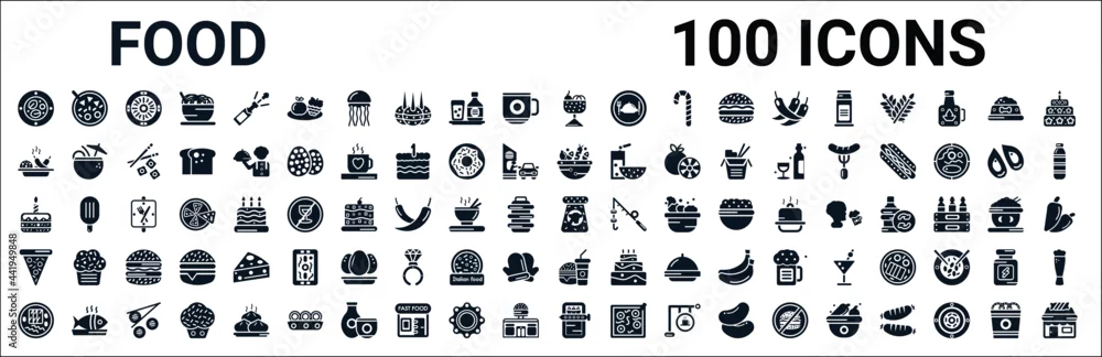 set of 100 glyph food web icons. filled icons such as luosifen,spicy food,healthy food,celebration cake,fodder,triangular pizza slice,hamburger and drink,sardines. vector illustration