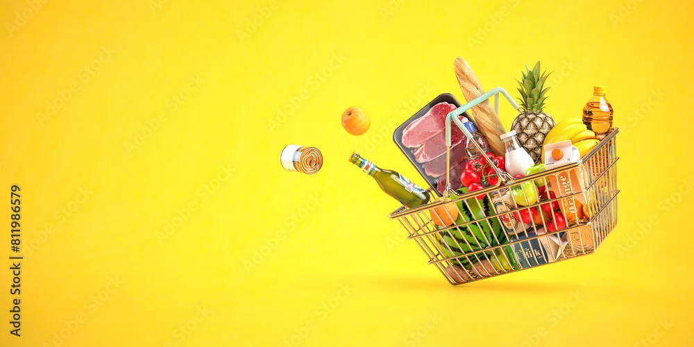 Fototapeta Shopping basket full of grocery products, food and drink on yellow background. - jedzenie - Picturewall.pl