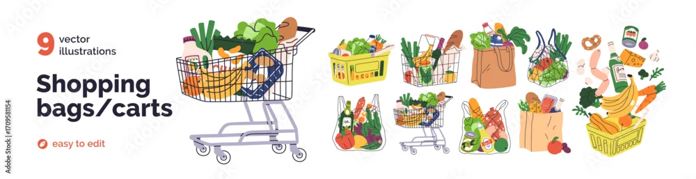Shopping carts, paper bags, plastic and metal baskets from grocery store. Trolleys full of food products, purchases, vegetables, bread, fruits. Flat vector illustrations isolated on white background