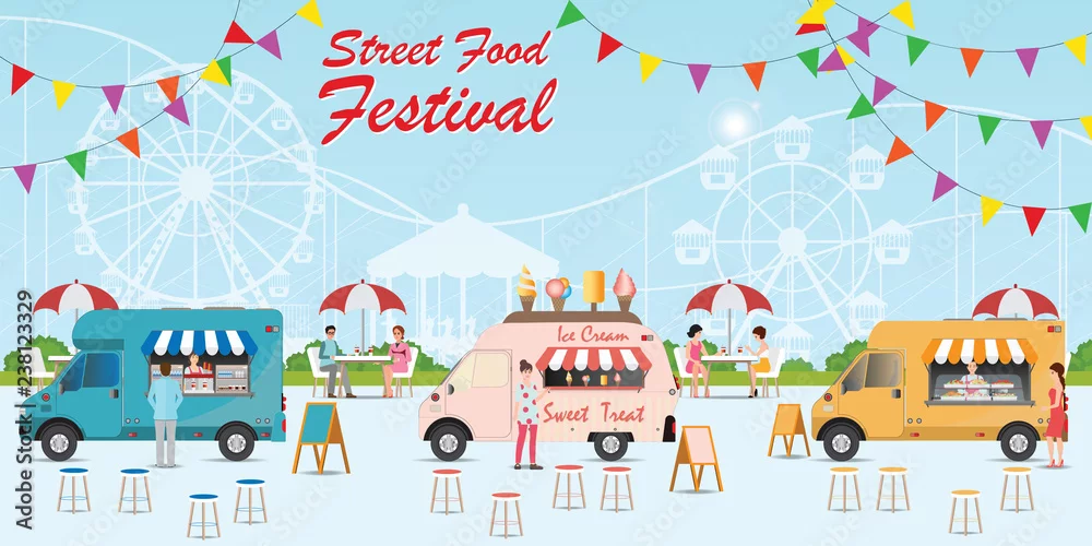 Fototapeta Street food truck festival with food and drink.