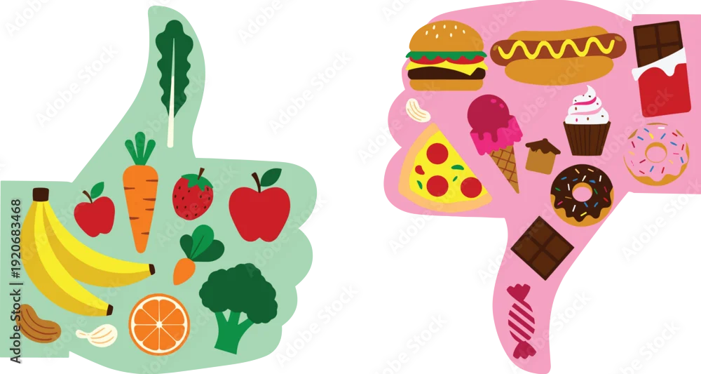 Fototapeta Thumbs up for healthy food including fruits and vegetables and thumbs down for unhealthy junk food like burgers and sweets - jedzenie - Picturewall.pl