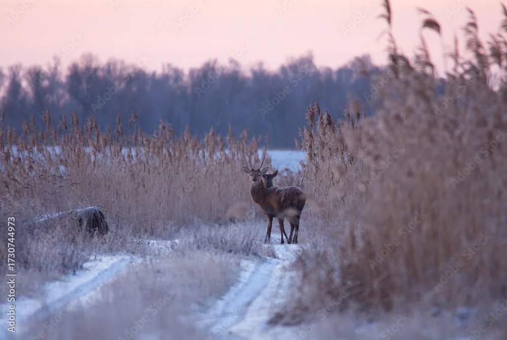 Fototapeta jelenie na drodze - jelenie - Picturewall.pl