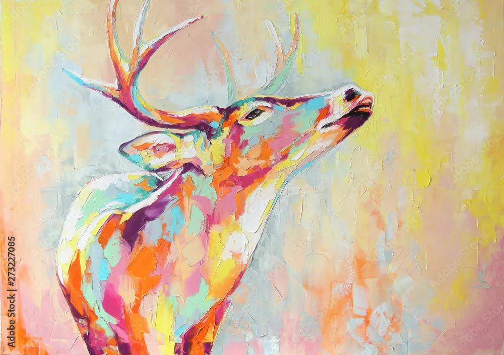 Fototapeta Malarstwo portretowe jelenia olejnego w barwnych kolorach. Koncepcyjne malarstwo abstrakcyjne pyska jelenia. Zbliżenie obraz olejny i szpachlą na płótnie.