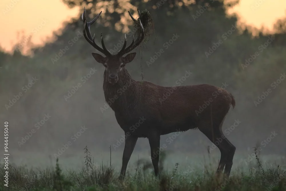 Fototapeta Portret jelenia o wschodzie słońca z trawami w porożu.