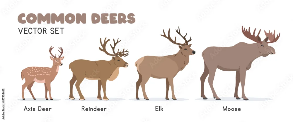Fototapeta Deers vector illustration set. Deer species cartoon clipart set in flat style. Axis deer, reindeer, elk, moose flat vector design. Wild animals concept - jelenie - Picturewall.pl
