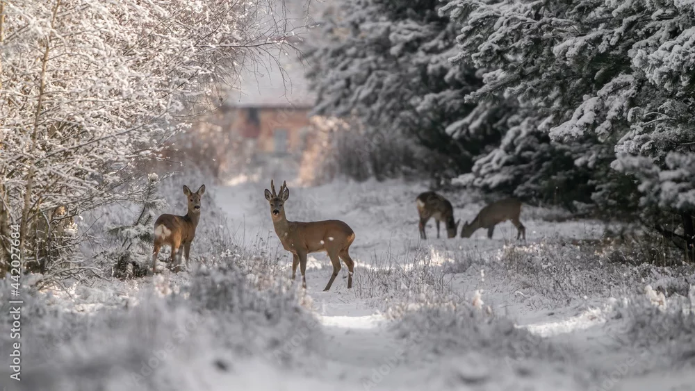 Fototapeta Sarna w zimie sarna w śniegu - jelenie - Picturewall.pl