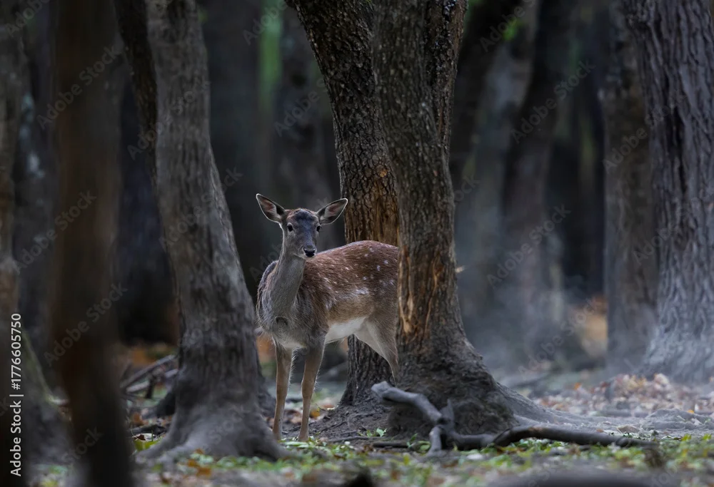 The wild european fallow deer female, Dama dama, during autumn rut at the edge of forest meadow. Photographed in natural light and wild natural forest.
