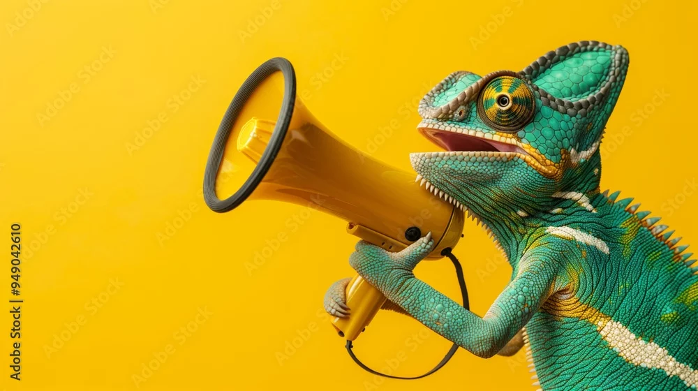Fototapeta A colorful chameleon wearing glasses enthusiastically uses a megaphone to capture attention on a vibrant yellow backdrop