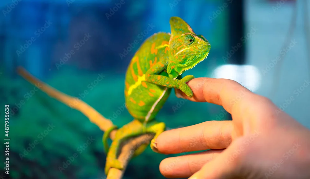 Beautiful Chameleon closeup isolated on white background. Multicolor beautiful reptile chameleon with colorful bright skin. The concept of disguise and bright skins. Exotic tropical animal.