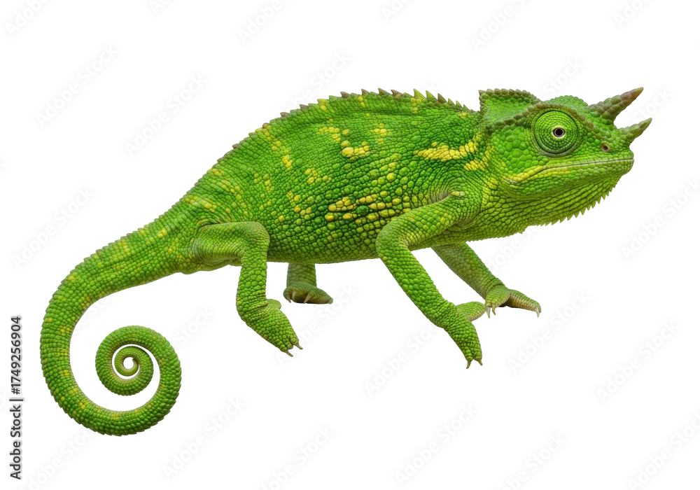 Green Jackson s chameleon isolated PNG, a reptile with three horns on transparent background Detailed skin texture, exotic pet for design use
