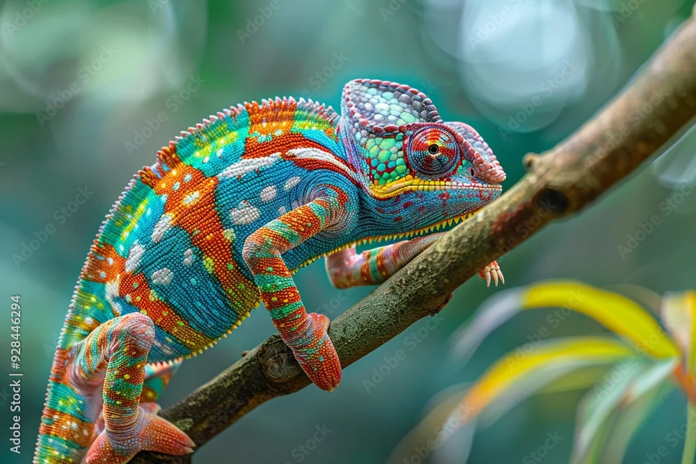 Fototapeta A brightly colored chameleon changing color on a branch copy space for highlighting adaptability or versatility. (Change