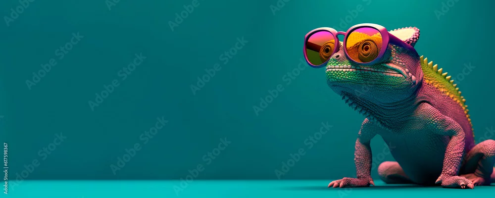 Fototapeta chameleon wearing sunglasses on a solid color background, vector art, digital art, faceted, minimal, abstract, panorama background. Generative AI. - kameleony - Picturewall.pl