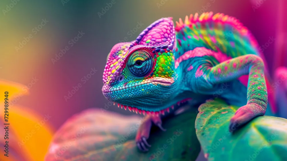 Fototapeta Colored chameleon. Painted animals with colored in their hair and black background. art paints Multi colored colorful on skin body and scales paint. Cute animals concept