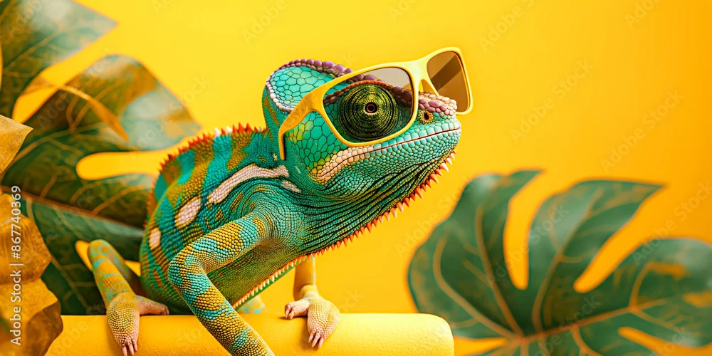 Fototapeta Colorful chameleon sporting stylish sunglasses on yellow background with tropical leaves.