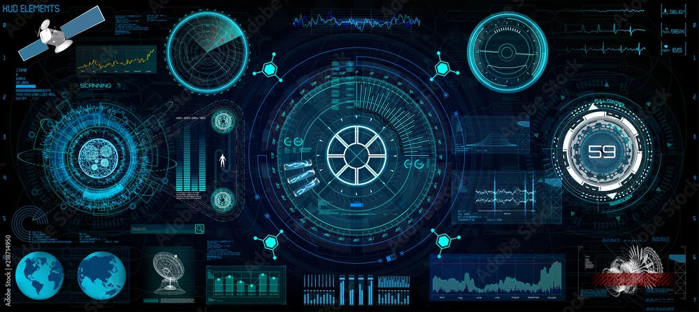 Fototapeta Zestaw interfejsu Head-Up do projektowania GUI, UI, UX. Styl interfejsu, zestaw elementów technologii (przestrzeń, deska rozdzielcza, hologram, statek kosmiczny, medycyna, finanse, analizy) Widok z interfejsu kokpitu statek kosmiczny w stylu interfejsu uż