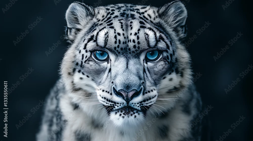 Fototapeta Powerful snow leopard with thick white and grey spotted fur and piercing blue eyes staring intensely in a dramatic closeup portrait of a fierce wild feline in a winter wilderness