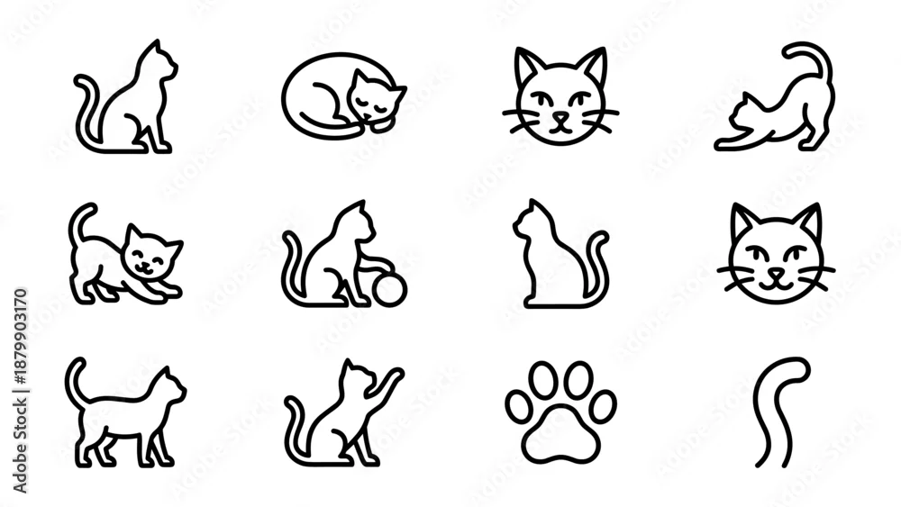 Set of 12 cat and feline line icons. Minimalist vector style. Cute kitty pet silhouette. Domestic kitten symbol. Animal paw tail outline. Linear logo graphic. Uniform stroke width.