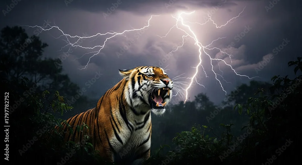 Fototapeta A beautiful striped predator tiger with glowing eyes stalks in the night, basking in the sun, and leaping in the sky as a majestic wildlife feline