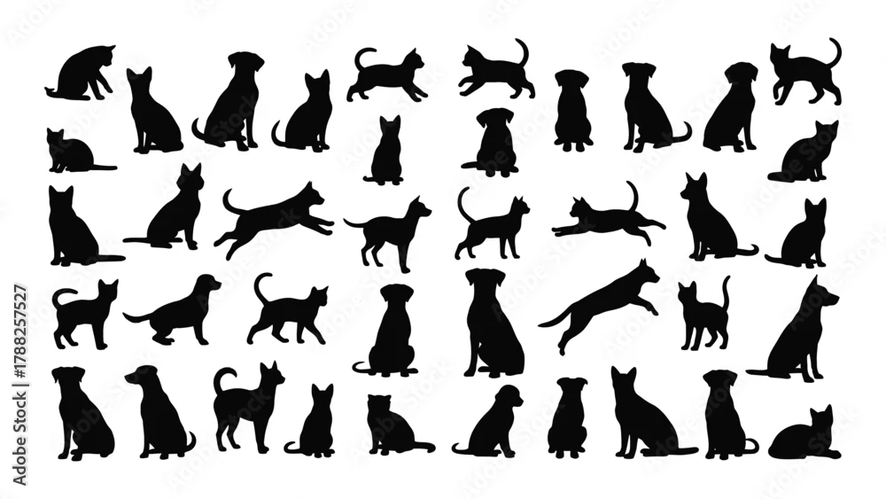 Fototapeta Collection of dog and cat silhouettes isolated on white background, Vector - koty - Picturewall.pl