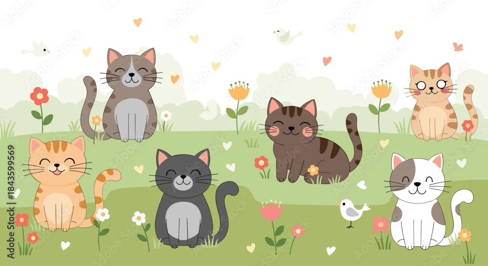 Fototapeta Colorful garden scene with a playful group of six cats among flowers birds and hearts under a bright sunny sky in cheerful soft tones.