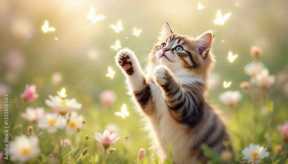 Fototapeta cute cat playing with butterfly