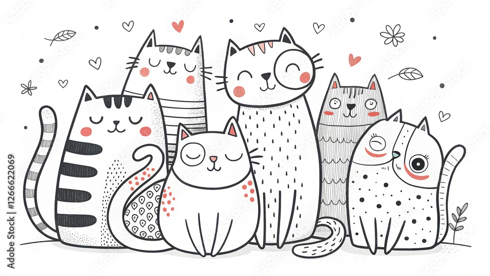 Fototapeta Cute cats family, happy cats together, lovely cats illustration, cats cartoon, cute kittens, pets, cat illustration, cat art, adorable cats, funny cats, feline friends, happy pets, kitty cats.