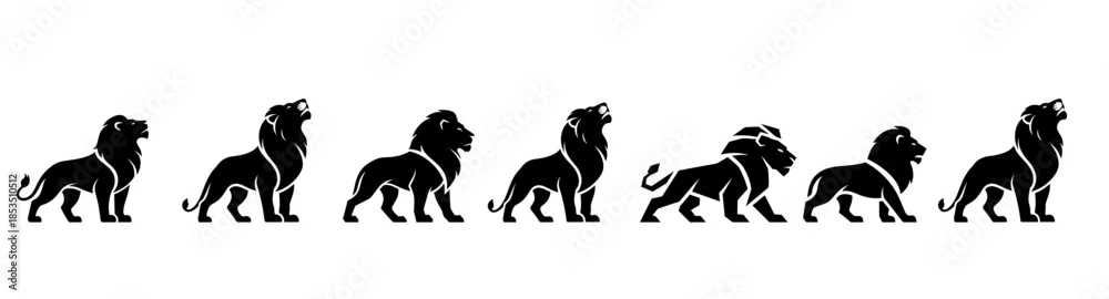 Fototapeta Dynamic collection of black lion silhouettes, depicting majestic felines in various poses from walking to roaring, symbolizing strength, courage, and wildlife elegance