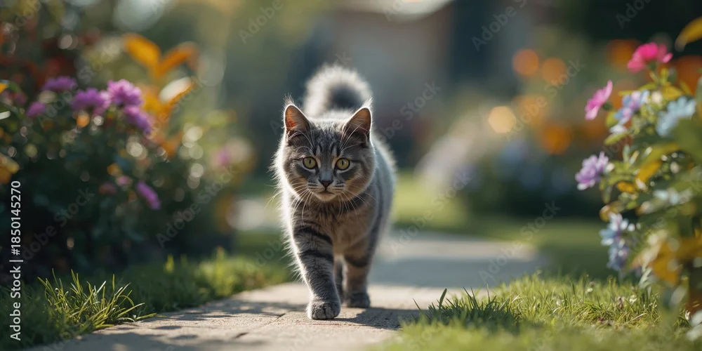 Fototapeta Gray feline strolling through the garden, highlighting animal activity in a natural setting - koty - Picturewall.pl
