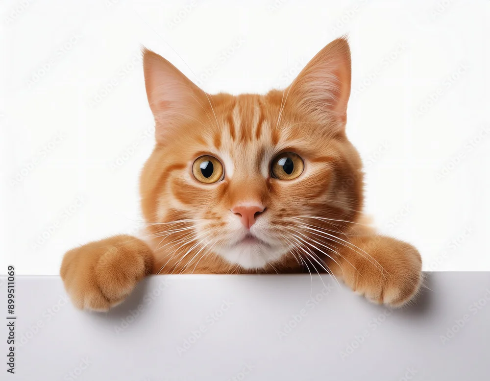 Fototapeta Portrait of ginger cat peeking from behind blank banner. Isolated on white background