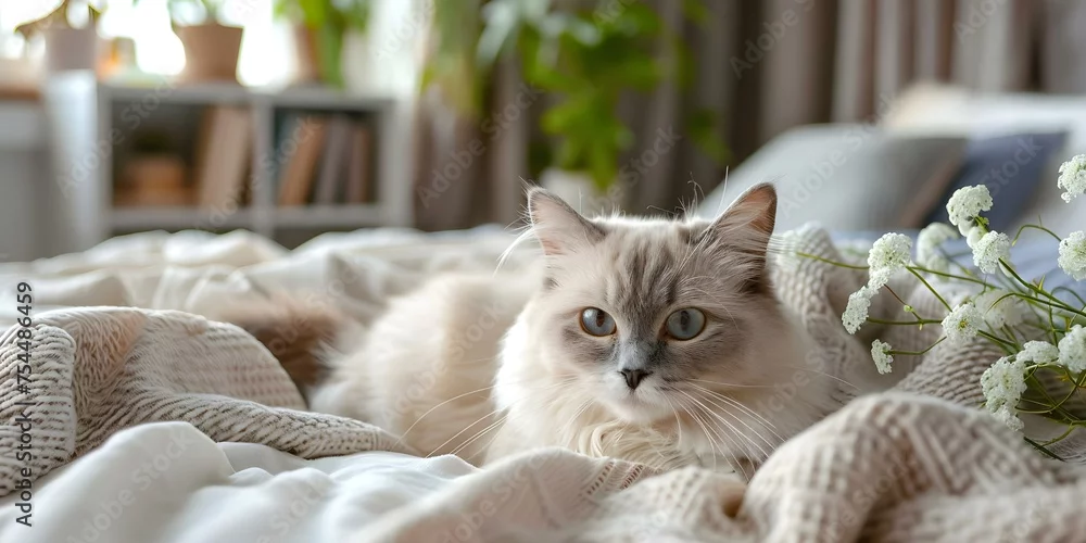 Fototapeta Professional photo of a Ragdoll cat relaxing in a modern room with copy space. Concept Cat photography, Pet portraits, Indoor setting, Modern interior design, Copy space