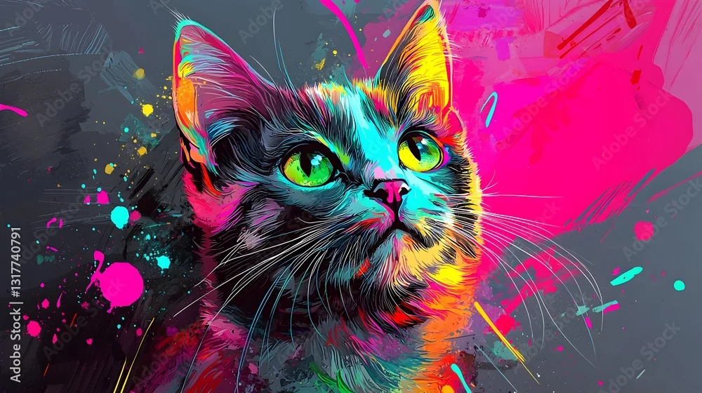 Fototapeta Psychedelic Cat Portrait: A vibrant and surreal depiction of a domestic cat, its features accentuated by an explosion of bold colors and dynamic brushstrokes.