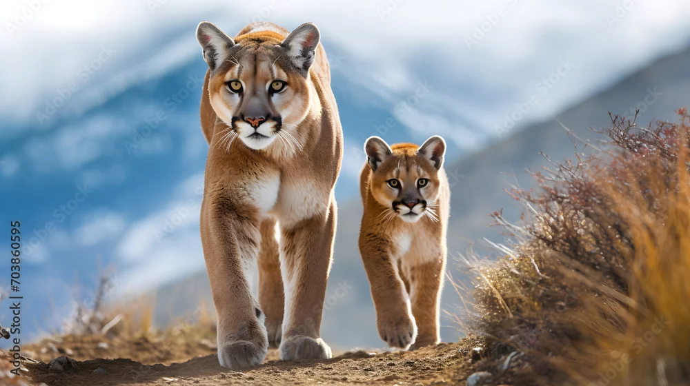 Fototapeta puma and her cub walking in the desert highlands - koty - Picturewall.pl