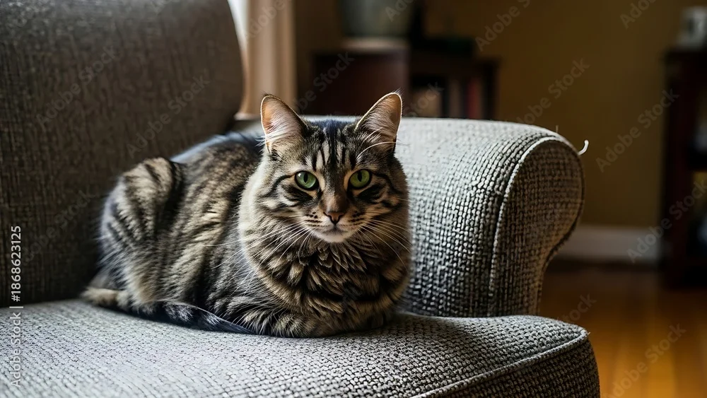 Fototapeta Tabby cat sitting near window looking outside, natural daylight, peaceful mood
