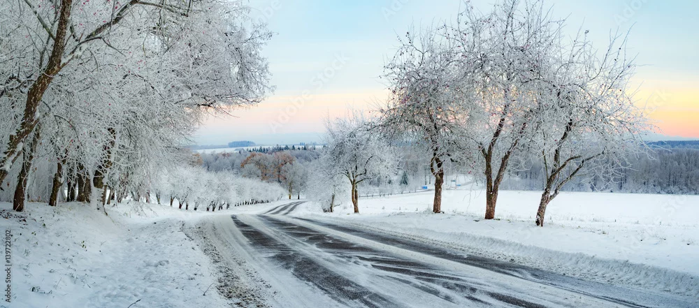 Fototapeta Zimowy pejzaż z zaśnieżoną drogą i mroźnymi drzewami