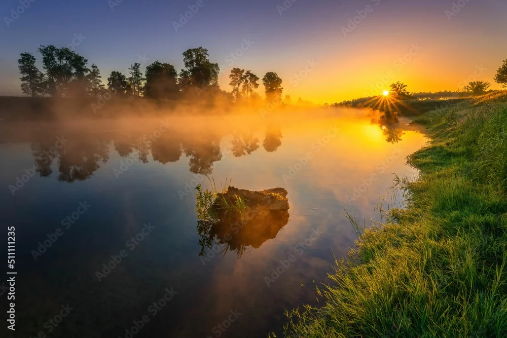 Fototapeta Wschód słońca nad rzeką Wartą. Słońce, mgła i rzeka o świcie