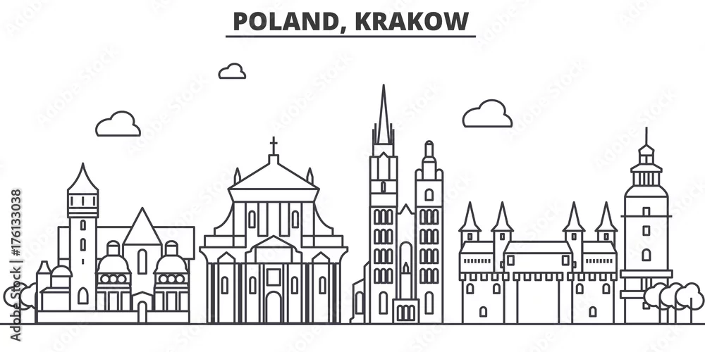 Fototapeta Polska, Kraków architektura linii skyline ilustracja. Liniowy wektor gród ze słynnych zabytków, zabytków, ikony designu. Obrysy edytowalne