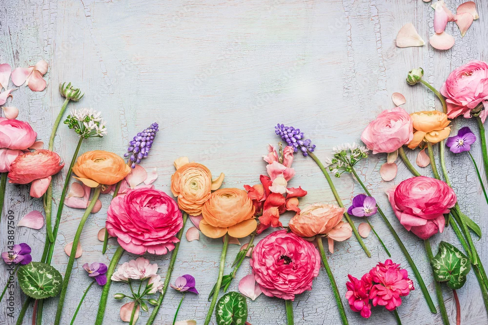 Fototapeta Granica Różnorodny piękny ogród kwitnie na podławym modnym tle, rama, odgórny widok, kwiecista granica - kwiaty - Picturewall.pl