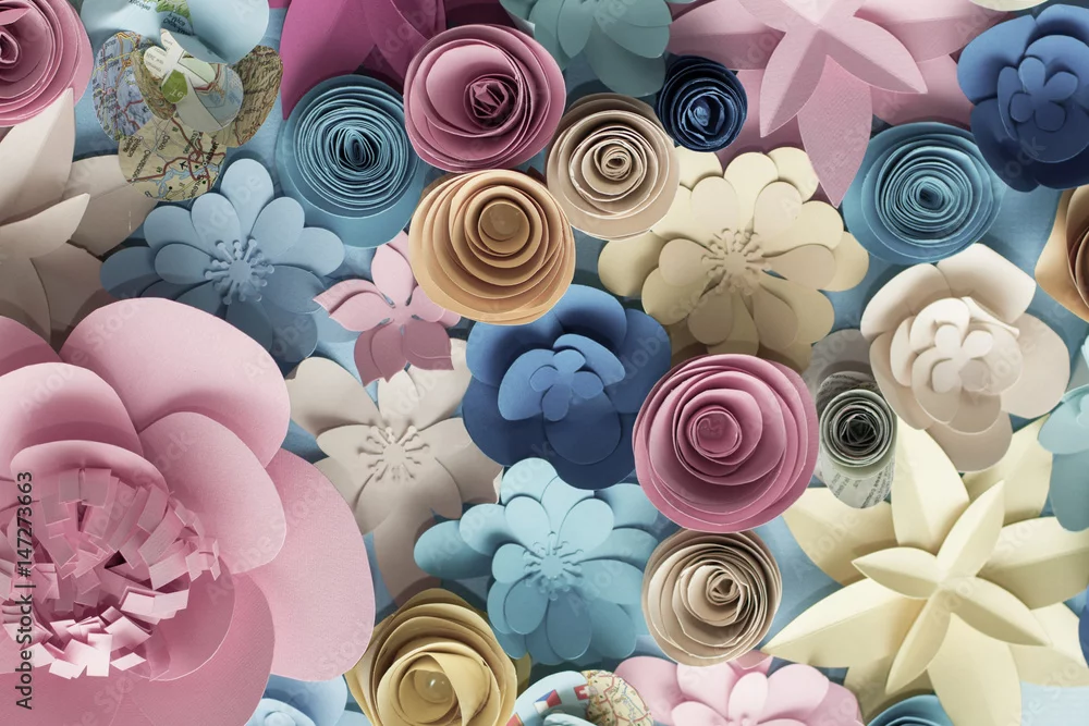 Fototapeta Kwiecisty modny abstrakcjonistyczny tło z 3d papierowymi kwiatami - kwiaty - Picturewall.pl