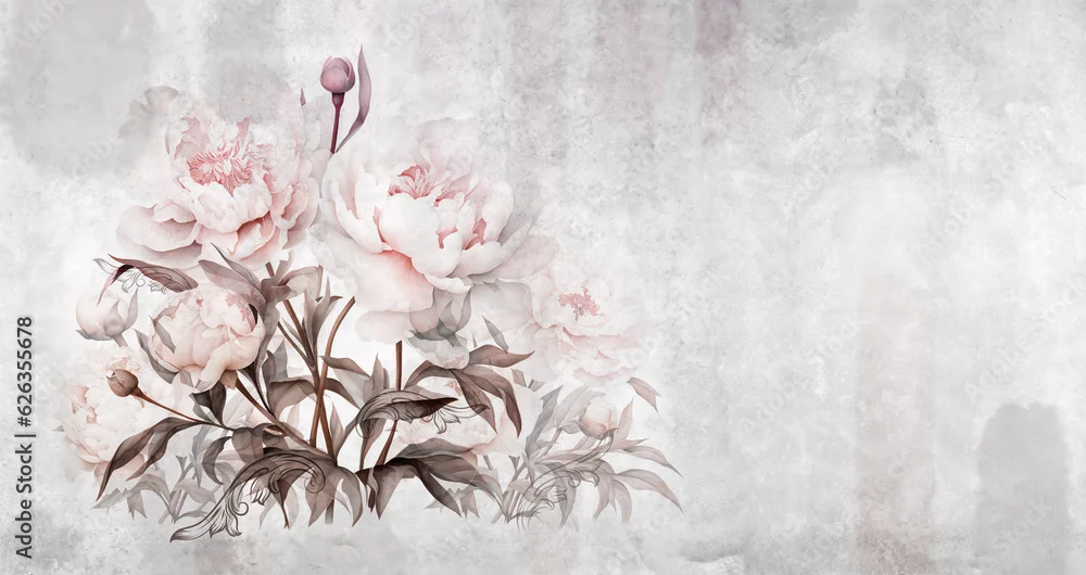 Fototapeta Peonies. Beautiful macro flower illustration on concrete grunge wall. Floral background for wallpaper, photo wallpaper, mural, card, postcard, painting. Design in the loft, classic, modern style.