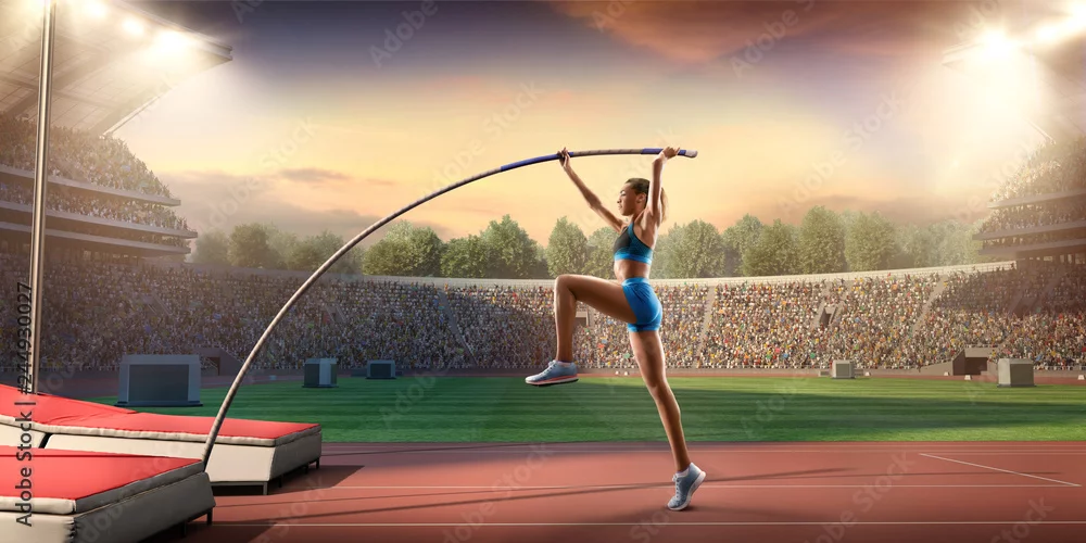 Fototapeta Młoda kobieta sportowiec skoku o tyczce z drążkiem. Kobiety w strojach sportowych na torze sportowym w profesjonalnym stadionie