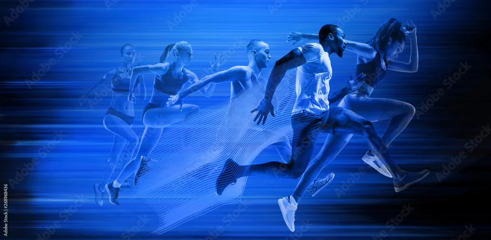 Fototapeta Młody afroamerykański i caucasian mężczyzna i kobiet biegać odizolowywam na błękitnym pracownianym tle. Sylwetka jogging sportowców z cieniami w świetle neonowym. Ruch lub ruch. Kreatywny kolaż.