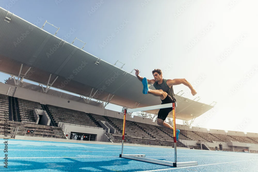 Fototapeta Sportowiec przeskakując przeszkodę na bieżni