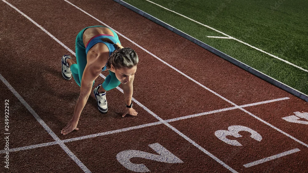 Fototapeta Tła sportowe. Sprinter startujący na arenie sportowej.